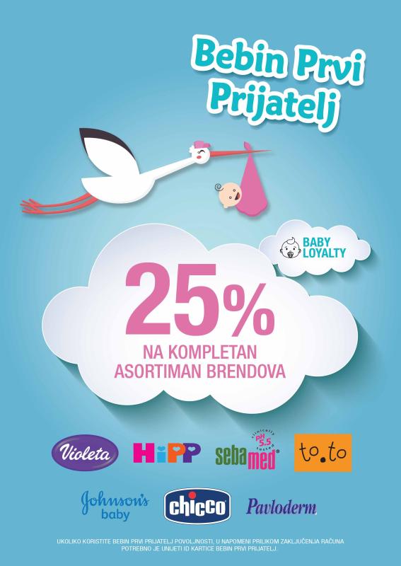 Uz karticu ostvarujete 25% popusta na kompletan asortiman brendova: Violeta, Pavloderm, Johnson & Johnson, Sebamed, HiPP, Chicco i To.To.